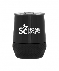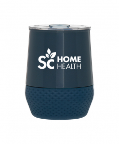 12 oz double wall 18/8 stainless steel thermal tumbler with copper vacuum insulation, push-on lid, matching swivel closure, and removable silicone base.