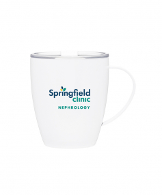 12 oz double wall 18/8 stainless steel thermal mug with copper vacuum insulation, clear acrylic push-on lid, and matching swivel; Hand wash recommended; Do not microwave; 4-7/16" h x 4"w (4-7/8 with handle) ; 355mL.