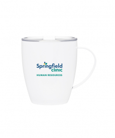 12 oz double wall 18/8 stainless steel thermal mug with copper vacuum insulation, clear acrylic push-on lid, and matching swivel; Hand wash recommended; Do not microwave; 4-7/16" h x 4"w (4-7/8 with handle) ; 355mL.