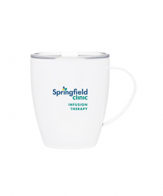 12 oz double wall 18/8 stainless steel thermal mug with copper vacuum insulation, clear acrylic push-on lid, and matching swivel; Hand wash recommended; Do not microwave; 4-7/16" h x 4"w (4-7/8 with handle) ; 355mL.