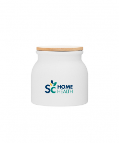 16.9 oz stoneware: matte white out / glossy white in with push-on bamboo lid; Hand wash recommended; Microwave safe with non-metallic imprint; 4 3/16 h x 4 3/16 (w/handle) w ; 500mL.
