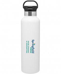 24 oz powder coated double wall 18/8 stainless steel thermal bottle with copper vacuum insulation, threaded gear-shaped insulated lid and carrying handle Complies with FDA, Prop 65. 11.25" H x 3" W