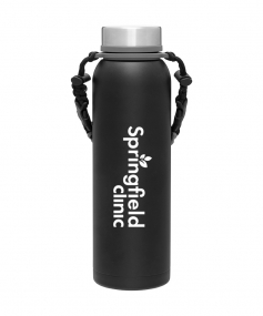 32 oz double wall 18/8 stainless steel thermal bottle with copper vacuum insulation, insulated stainless steel threaded lid, silicone ring, removable strap with buckles, removable clasps, and powder coated finish. Individual gift box. Hand wash recommended. Do not microwave. Complies with FDA, Prop 65. 11" H x 3.1875" W