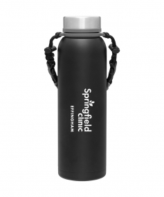 32 oz double wall 18/8 stainless steel thermal bottle with copper vacuum insulation, insulated stainless steel threaded lid, silicone ring, removable strap with buckles, removable clasps, and powder coated finish. Individual gift box. Hand wash recommended. Do not microwave. Complies with FDA, Prop 65. 11" H x 3.1875" W