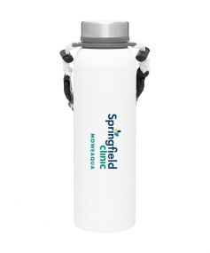 32 oz double wall 18/8 stainless steel thermal bottle with copper vacuum insulation, insulated stainless steel threaded lid, silicone ring, removable strap with buckles, removable clasps, and powder coated finish. Individual gift box. Hand wash recommended. Do not microwave. Complies with FDA, Prop 65. 11" H x 3.1875" W