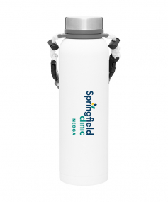 32 oz double wall 18/8 stainless steel thermal bottle with copper vacuum insulation, insulated stainless steel threaded lid, silicone ring, removable strap with buckles, removable clasps, and powder coated finish. Individual gift box. Hand wash recommended. Do not microwave. Complies with FDA, Prop 65. 11" H x 3.1875" W