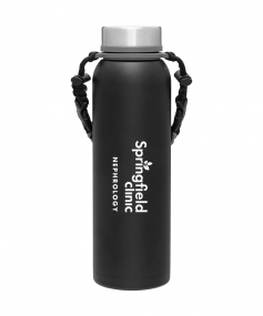 32 oz double wall 18/8 stainless steel thermal bottle with copper vacuum insulation, insulated stainless steel threaded lid, silicone ring, removable strap with buckles, removable clasps, and powder coated finish. Individual gift box. Hand wash recommended. Do not microwave. Complies with FDA, Prop 65. 11" H x 3.1875" W