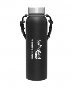 32 oz double wall 18/8 stainless steel thermal bottle with copper vacuum insulation, insulated stainless steel threaded lid, silicone ring, removable strap with buckles, removable clasps, and powder coated finish. Individual gift box. Hand wash recommended. Do not microwave. Complies with FDA, Prop 65. 11" H x 3.1875" W