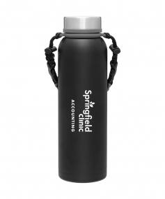 32 oz double wall 18/8 stainless steel thermal bottle with copper vacuum insulation, insulated stainless steel threaded lid, silicone ring, removable strap with buckles, removable clasps, and powder coated finish. Individual gift box. Hand wash recommended. Do not microwave. Complies with FDA, Prop 65. 11" H x 3.1875" W