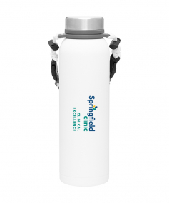 32 oz double wall 18/8 stainless steel thermal bottle with copper vacuum insulation, insulated stainless steel threaded lid, silicone ring, removable strap with buckles, removable clasps, and powder coated finish. Individual gift box. Hand wash recommended. Do not microwave. Complies with FDA, Prop 65. 11" H x 3.1875" W