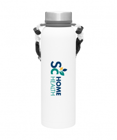 32 oz double wall 18/8 stainless steel thermal bottle with copper vacuum insulation, insulated stainless steel threaded lid, silicone ring, removable strap with buckles, removable clasps, and powder coated finish. Individual gift box. Hand wash recommended. Do not microwave. Complies with FDA, Prop 65. 11" H x 3.1875" W