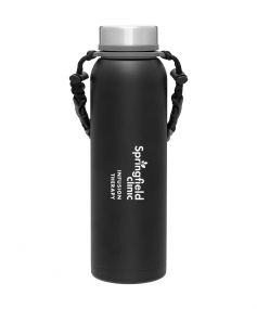 32 oz double wall 18/8 stainless steel thermal bottle with copper vacuum insulation, insulated stainless steel threaded lid, silicone ring, removable strap with buckles, removable clasps, and powder coated finish. Individual gift box. Hand wash recommended. Do not microwave. Complies with FDA, Prop 65. 11" H x 3.1875" W