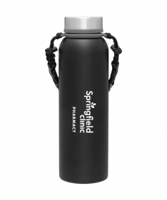 32 oz double wall 18/8 stainless steel thermal bottle with copper vacuum insulation, insulated stainless steel threaded lid, silicone ring, removable strap with buckles, removable clasps, and powder coated finish. Individual gift box. Hand wash recommended. Do not microwave. Complies with FDA, Prop 65. 11" H x 3.1875" W