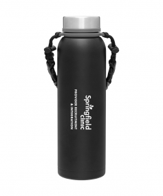 32 oz double wall 18/8 stainless steel thermal bottle with copper vacuum insulation, insulated stainless steel threaded lid, silicone ring, removable strap with buckles, removable clasps, and powder coated finish. Individual gift box. Hand wash recommended. Do not microwave. Complies with FDA, Prop 65. 11" H x 3.1875" W