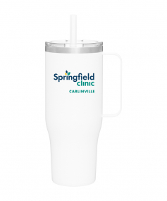 40 oz double wall 18/8 stainless steel thermal mug with copper vacuum insulation, stainless steel rim, dual-purpose push-on clear lid, matching sliding closure, flexible wide silicone straw, and powder coated finish. Individual gift box. Hand wash recommended. Do not microwave. Complies with FDA, Prop 65. 9.75" H x 4" W