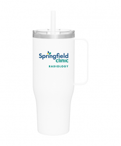 40 oz double wall 18/8 stainless steel thermal mug with copper vacuum insulation, stainless steel rim, dual-purpose push-on clear lid, matching sliding closure, flexible wide silicone straw, and powder coated finish. Individual gift box. Hand wash recommended. Do not microwave. Complies with FDA, Prop 65. 9.75" H x 4" W