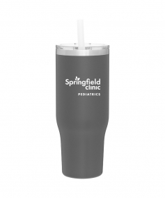 40 oz double wall 18/8 stainless steel thermal tumbler with copper vacuum insulation, stainless steel rim, dual-purpose push-on clear lid, matching sliding closure, flexible wide silicone straw, and powder coated finish