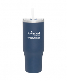 40 oz double wall 18/8 stainless steel thermal tumbler with copper vacuum insulation, stainless steel rim, dual-purpose push-on clear lid, matching sliding closure, flexible wide silicone straw, and powder coated finish