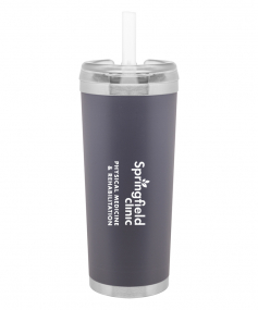 24 oz double wall 18/8 stainless steel thermal tumbler with copper vacuum insulation, stainless steel rim and base, threaded Eastman Tritan lid, snap closure, straw opening, and flexible wide silicone straw.