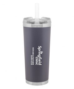 24 oz double wall 18/8 stainless steel thermal tumbler with copper vacuum insulation, stainless steel rim and base, threaded Eastman Tritan lid, snap closure, straw opening, and flexible wide silicone straw.