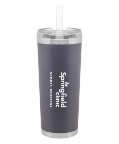 24 oz double wall 18/8 stainless steel thermal tumbler with copper vacuum insulation, stainless steel rim and base, threaded Eastman Tritan lid, snap closure, straw opening, and flexible wide silicone straw.