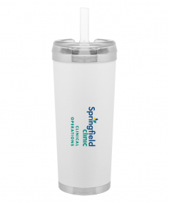 24 oz double wall 18/8 stainless steel thermal tumbler with copper vacuum insulation, stainless steel rim and base, threaded Eastman Tritan lid, snap closure, straw opening, and flexible wide silicone straw.