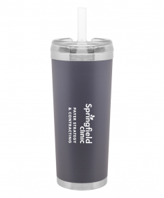 24 oz double wall 18/8 stainless steel thermal tumbler with copper vacuum insulation, stainless steel rim and base, threaded Eastman Tritan lid, snap closure, straw opening, and flexible wide silicone straw.