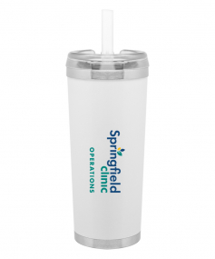 24 oz double wall 18/8 stainless steel thermal tumbler with copper vacuum insulation, stainless steel rim and base, threaded Eastman Tritan lid, snap closure, straw opening, and flexible wide silicone straw.