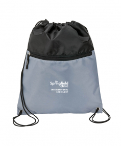 Sport bag with a contrast color front-zippered pocket, reinforced corners and a drawstring closure. Drawstrings double as backpack straps. 12 1/2" W x 15 1/2" H x 3/16" D.
