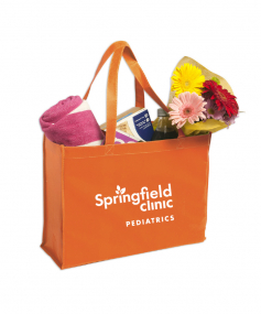Constructed of 80 gsm non-woven polypropylene with reinforced 22" handles and 6" gusset. Complies with Prop 65. 12" H x 16" W x 6" D