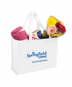 Constructed of 80 gsm non-woven polypropylene with reinforced 22" handles and 6" gusset. Complies with Prop 65. 12" H x 16" W x 6" D