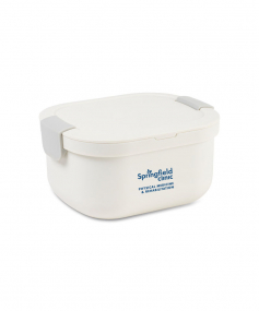 BPA free and made from food-grade materials. Includes fork, knife, and a 1.4 oz. dressing/sauce container that packs neatly into box. Two stackable compartments for separating and organizing meals and snacks. Lid has leakproof silicone sealing ring. Freezer safe and dishwasher safe (without lid). Microwave safe up to 3 minutes. Ideal for salads, sandwiches, or snacks on the go. 58 oz. capacity without inner tray. Complies with Prop 65. 3.9" W x 5.9" H x 7.4" L